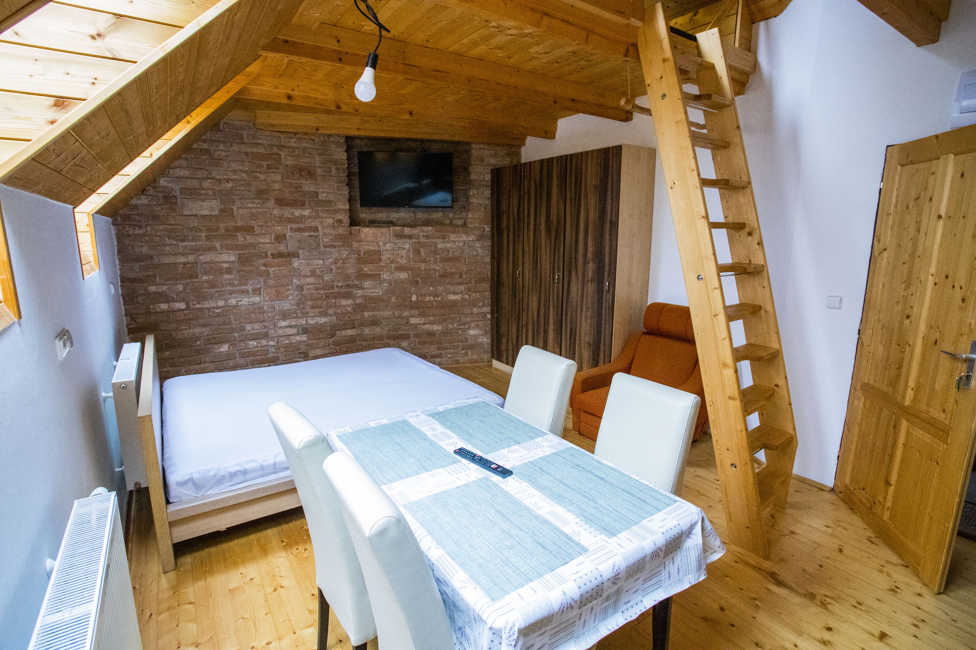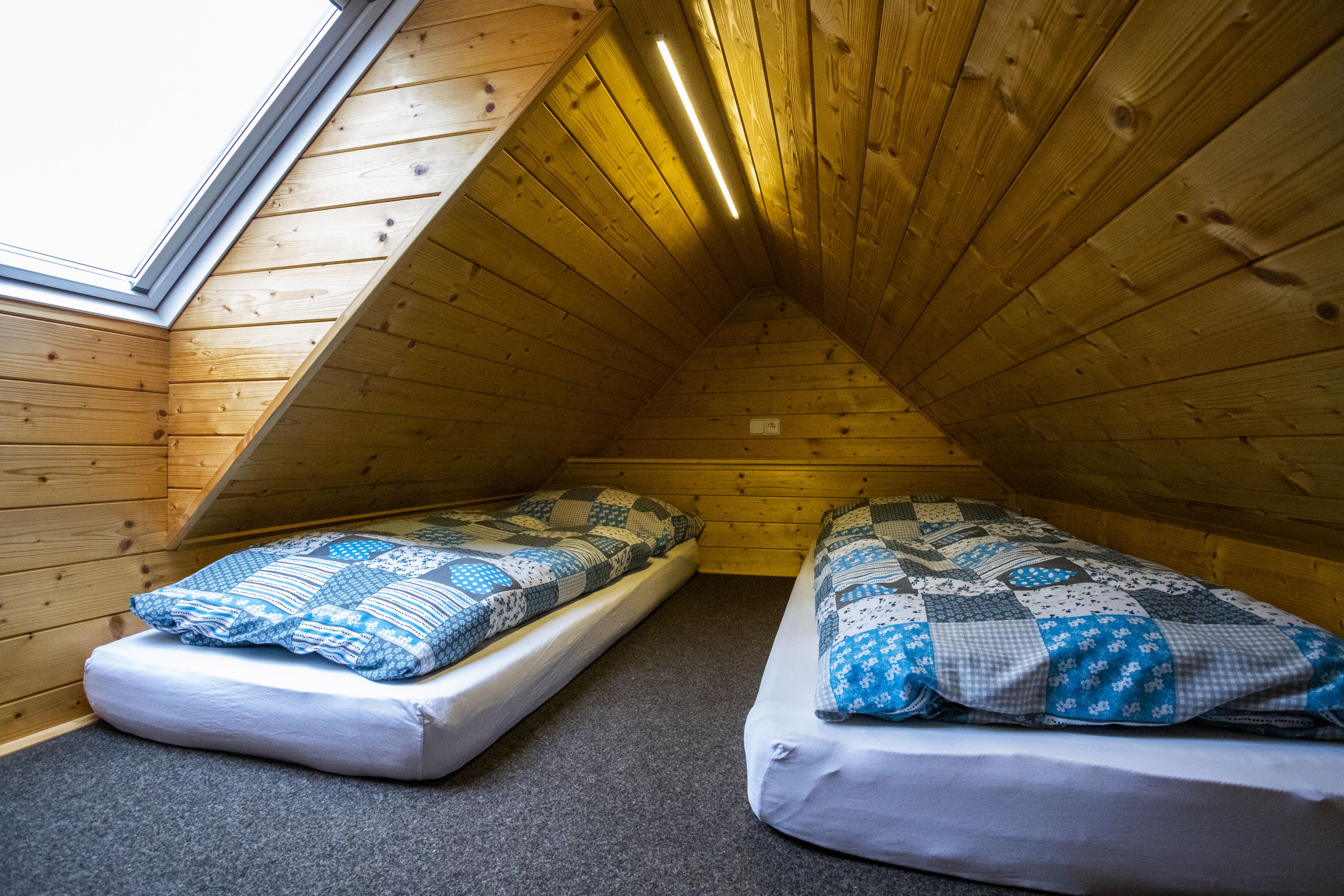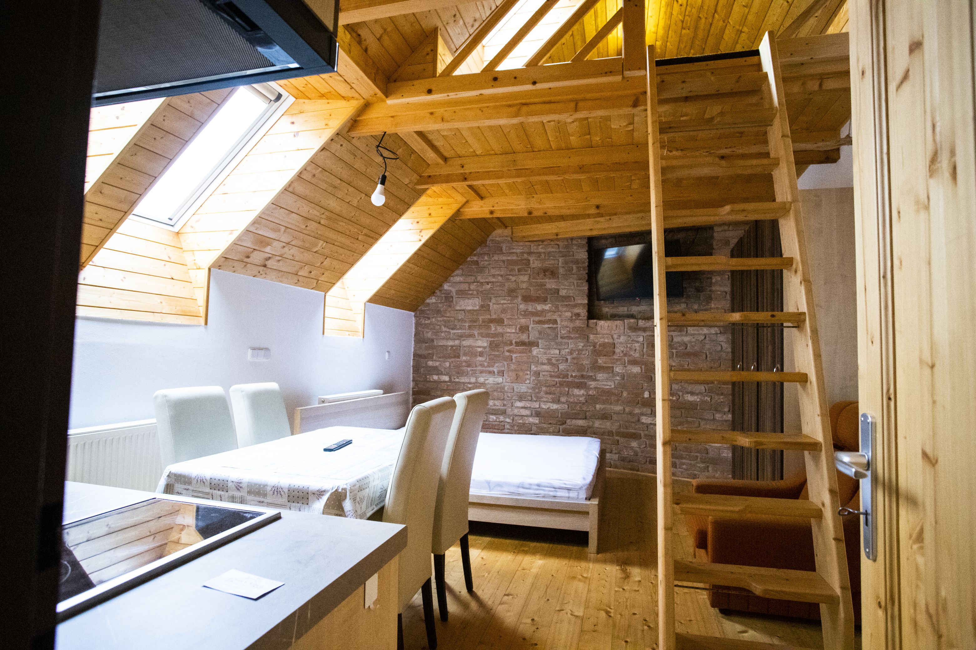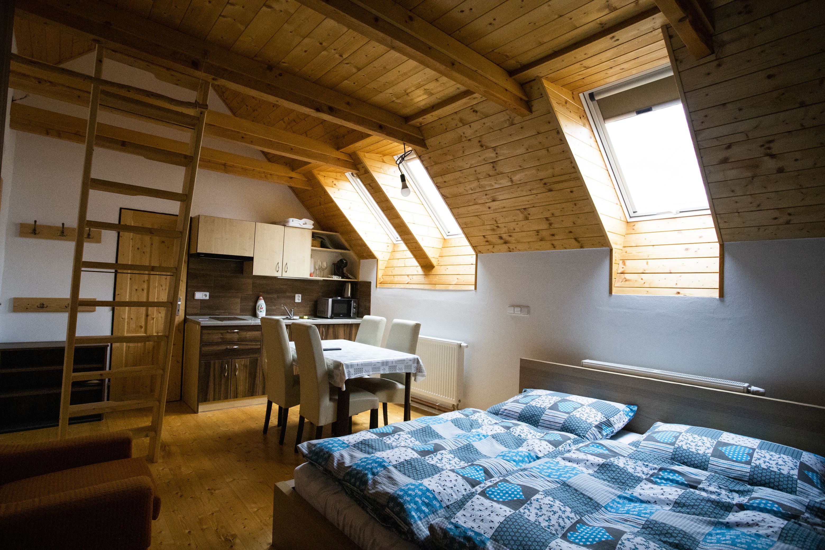 Kapacita 2-4 osoby (dvoulůžko a spaní na hambalku), vybavená kuchyňská linka a koupelna s WC. Plocha 26m2 + hambalek.