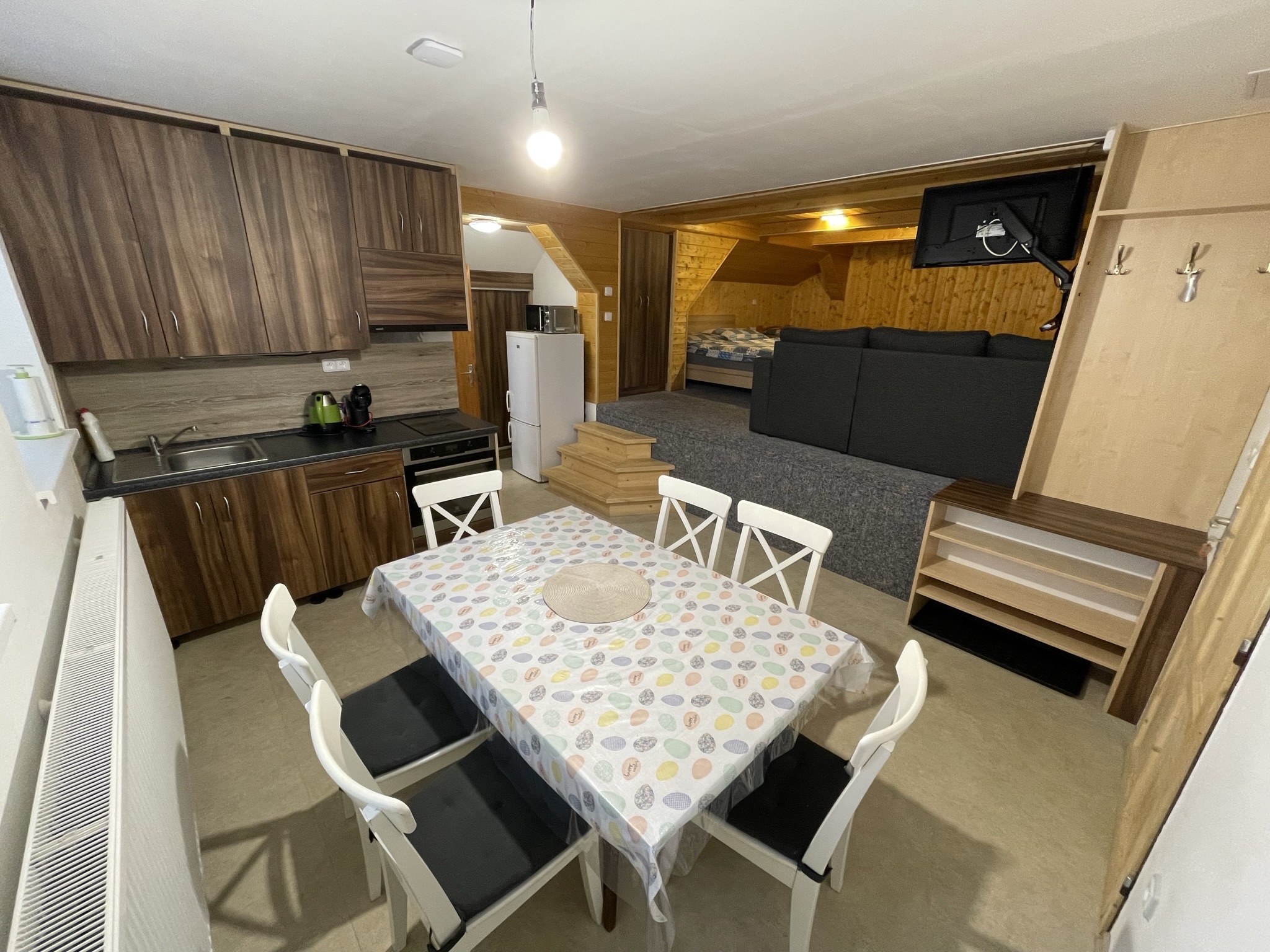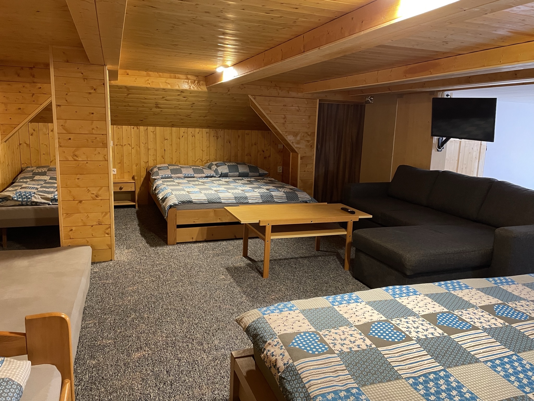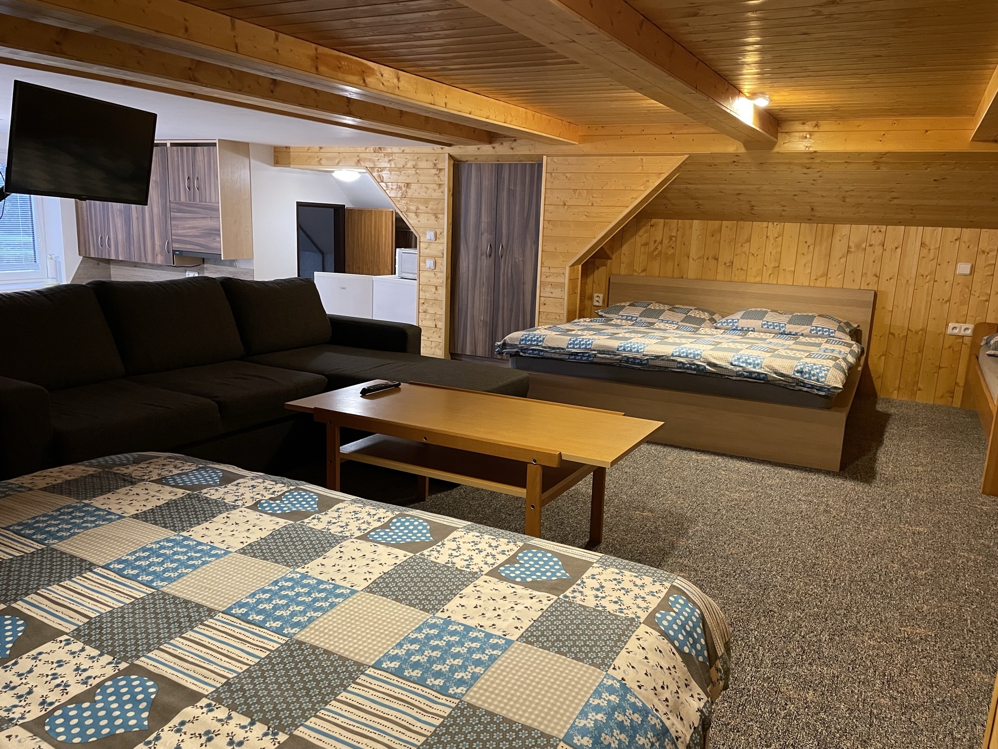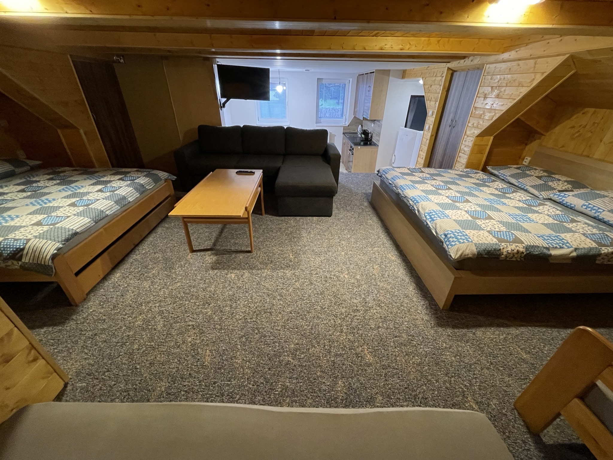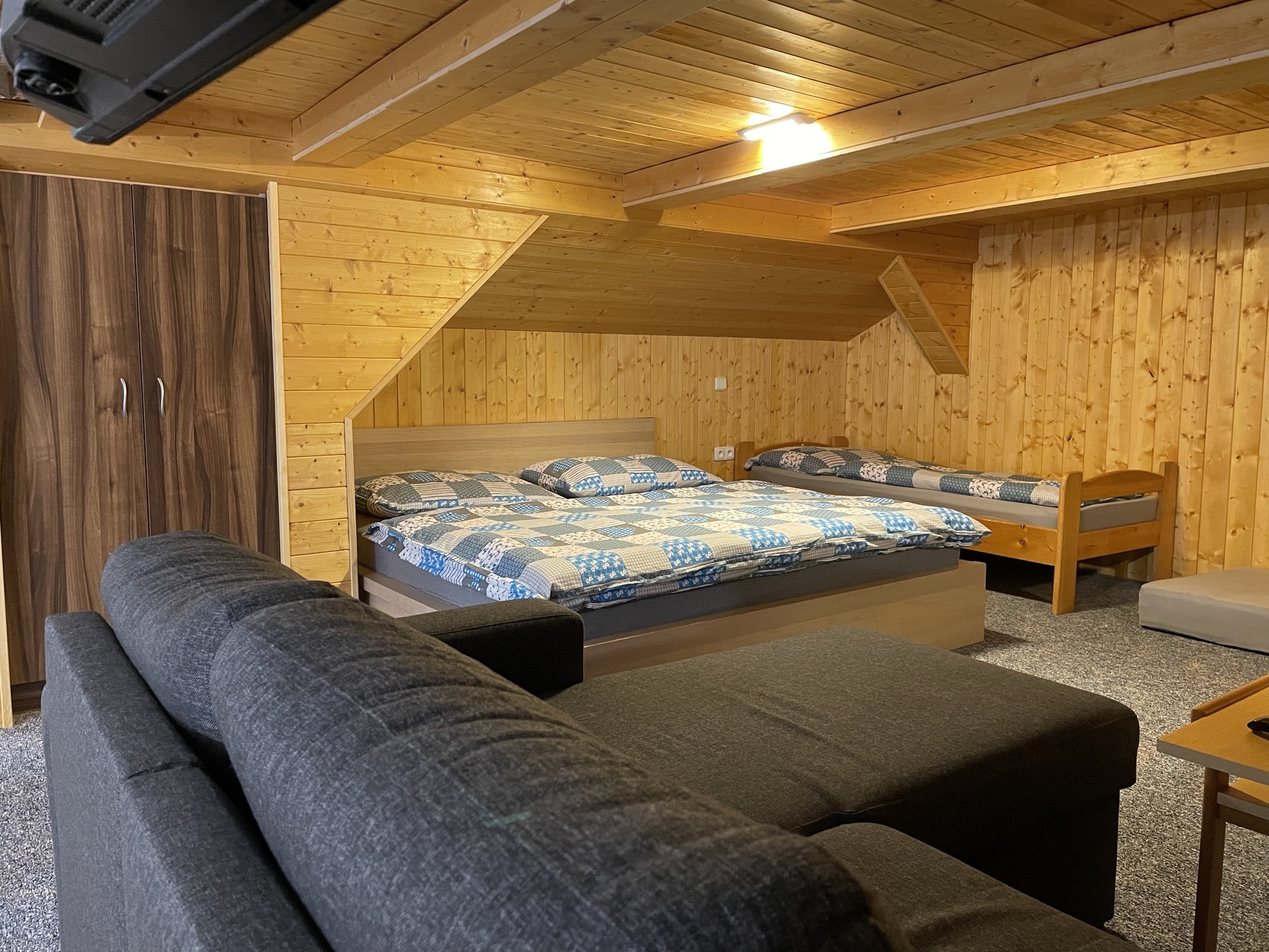 kapacita 2 až 8 osob (2x dvoulůžko, 2x jednolůžko, a možnost dvou přistýlek), vybavená kuchyňská linka a koupelna s WC. Plocha 55m2 (z toho 35m2 pro spaní se sníženou světlou výškou - cca 180cm)