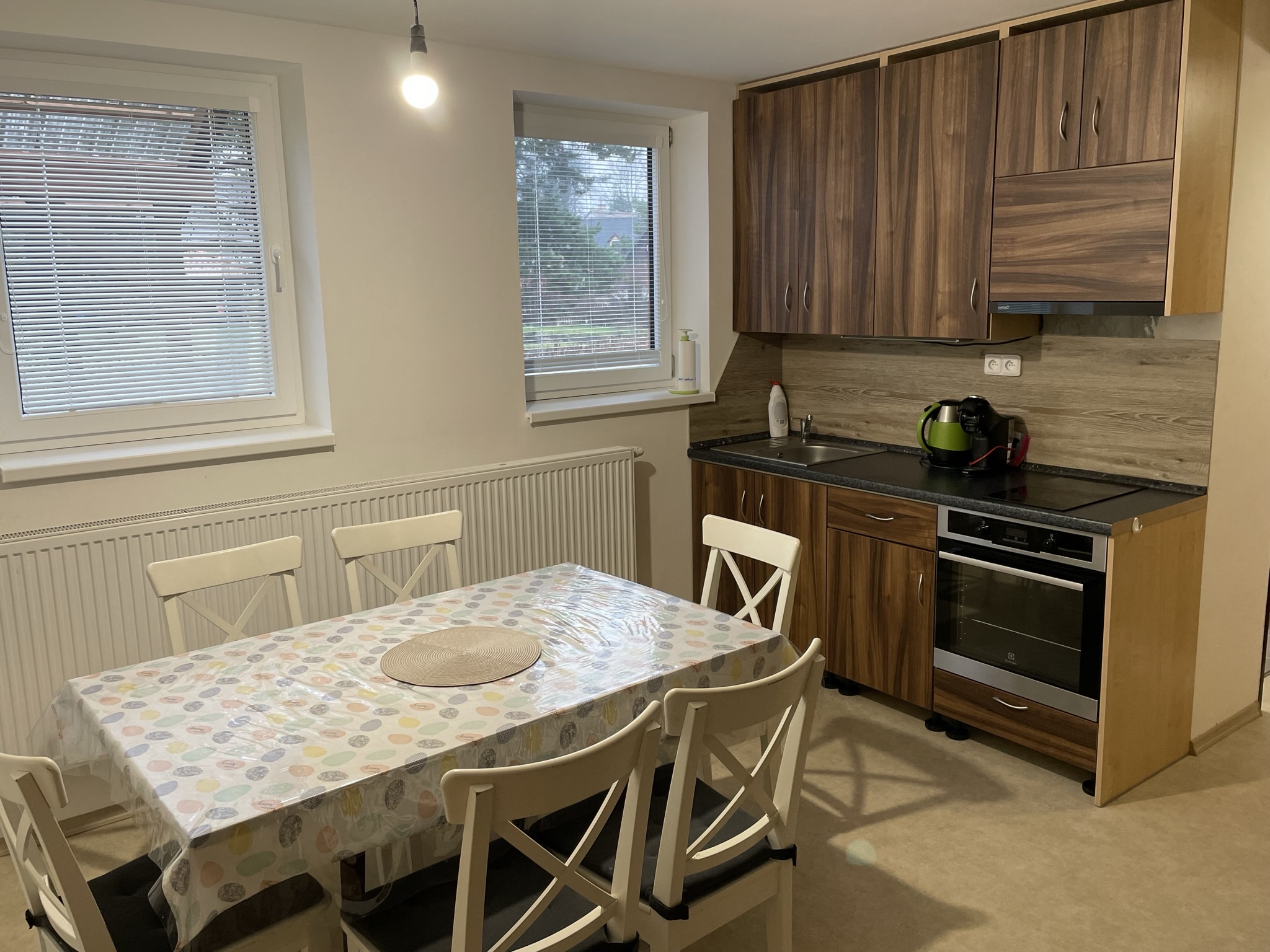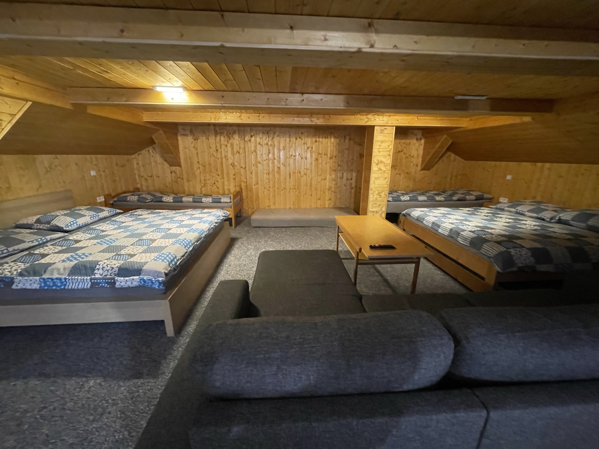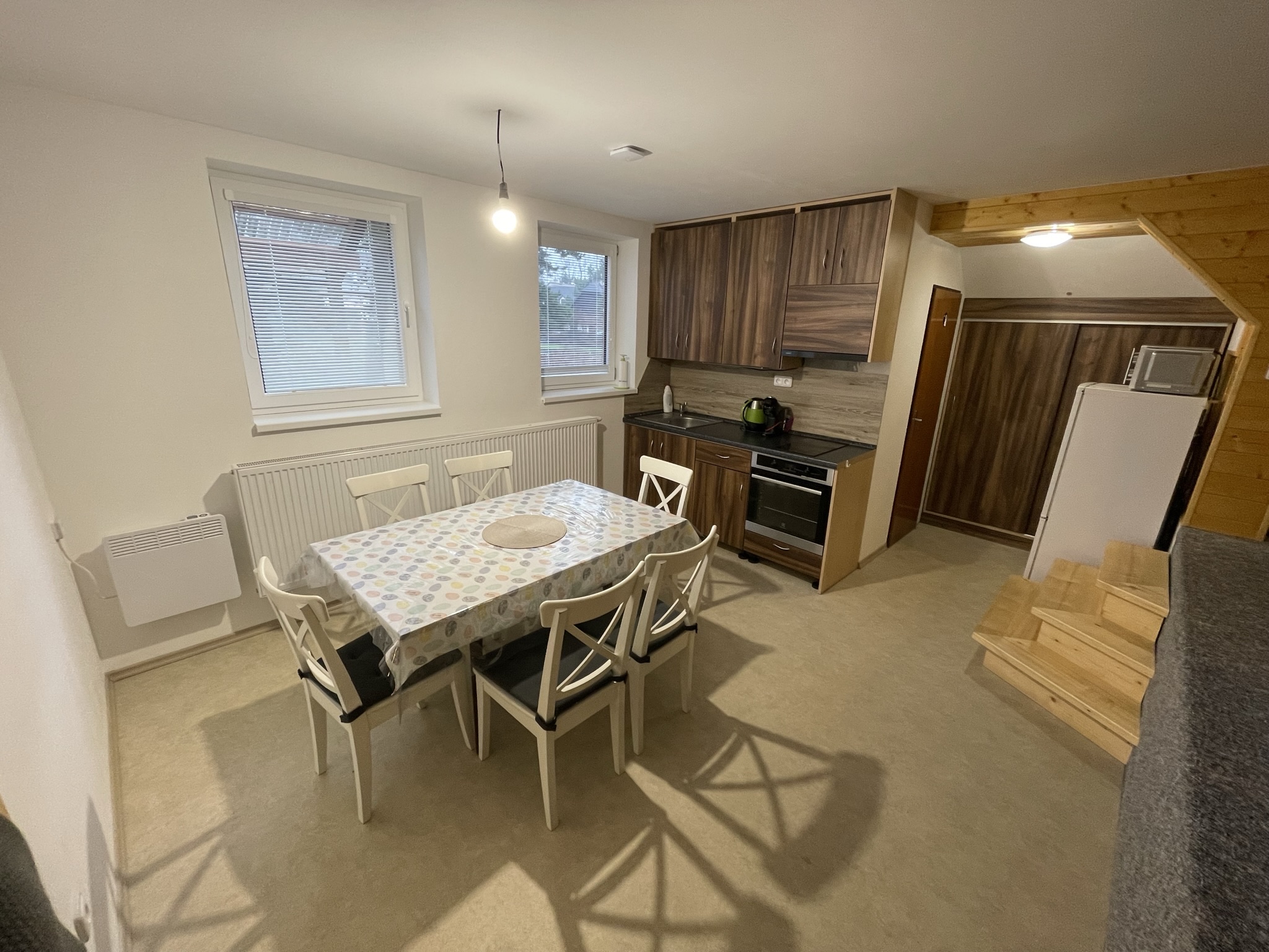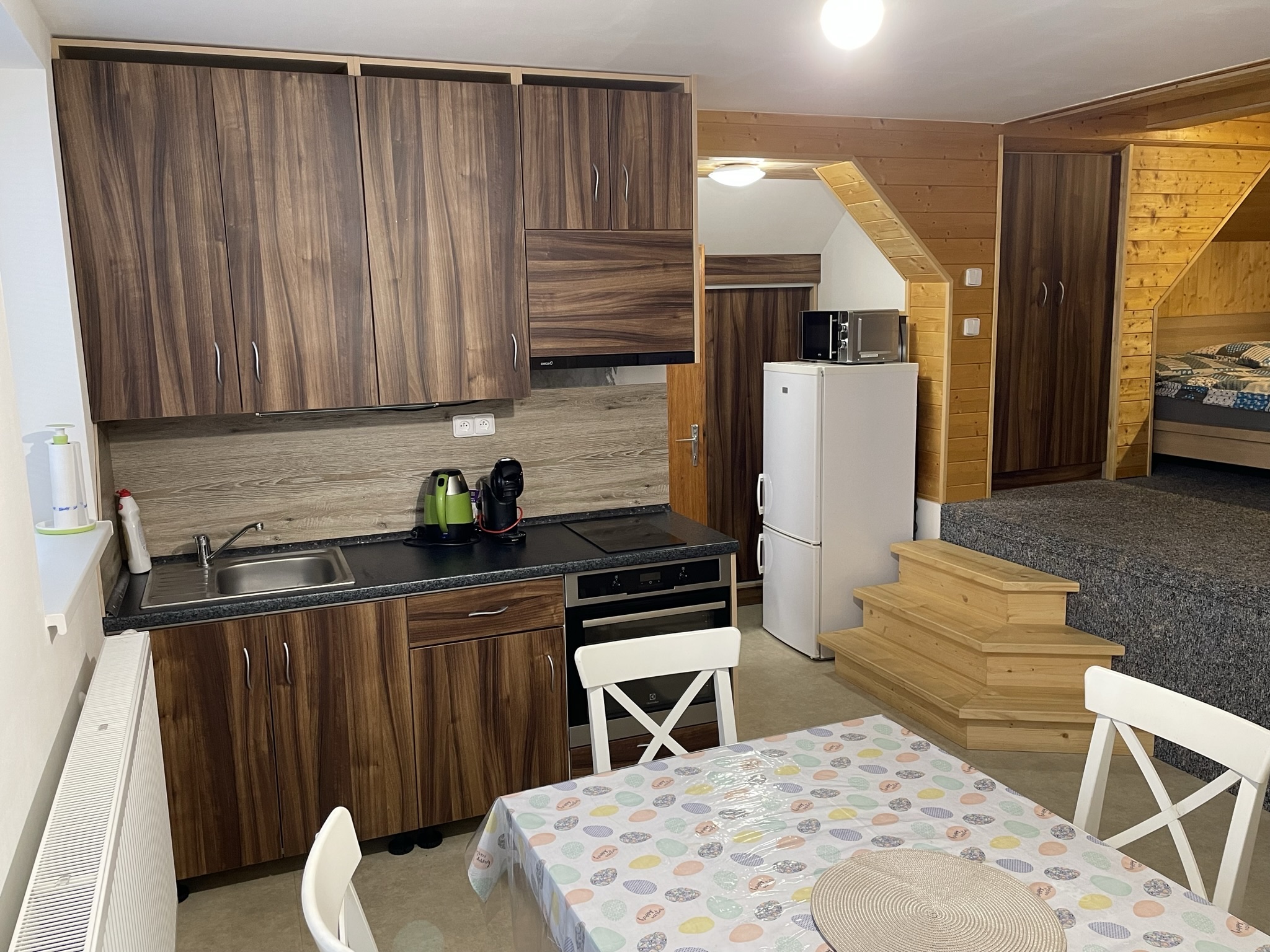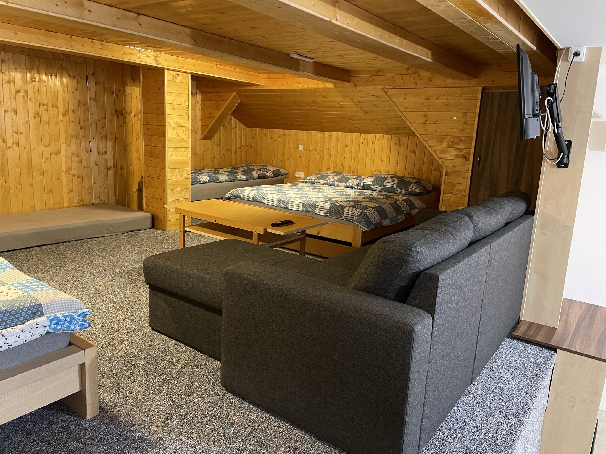 kapacita 2 až 8 osob (2x dvoulůžko, 2x jednolůžko, a možnost dvou přistýlek), vybavená kuchyňská linka a koupelna s WC. Plocha 55m2 (z toho 35m2 pro spaní se sníženou světlou výškou - cca 180cm)